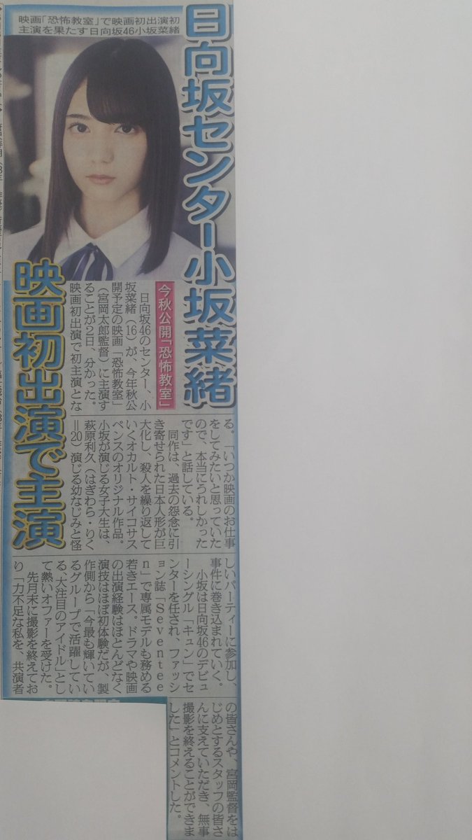 日刊スポーツから、日向坂46のこさかなこと小坂菜緒さんが、今秋公開予定の、宮岡太郎監督の映画「恐怖教室」で、映画初出演で初主演の記事です。