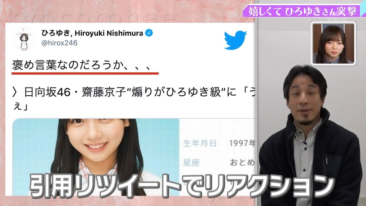 反応みるにやっぱ上の年齢のおひさまはlivedoorとか2chの印象があって否定的で、そこそこの世代のおひさまには世間を切るコメンテーター的な感じで肯定的、それより下の世代はひろゆきが誰かも知らないって感じで評価が別れてて面白いな