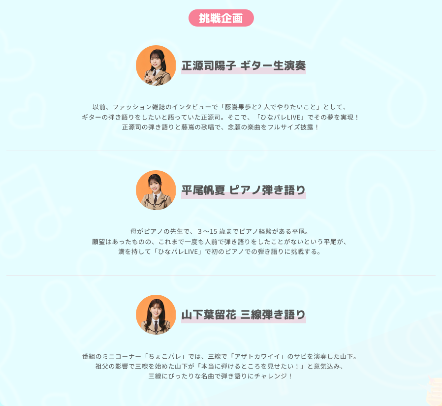 ソロ歌唱からすると、土曜がひらほー、日曜昼がはるはる、夜がしょげかほって感じかな?#ひなパレ #日向坂46